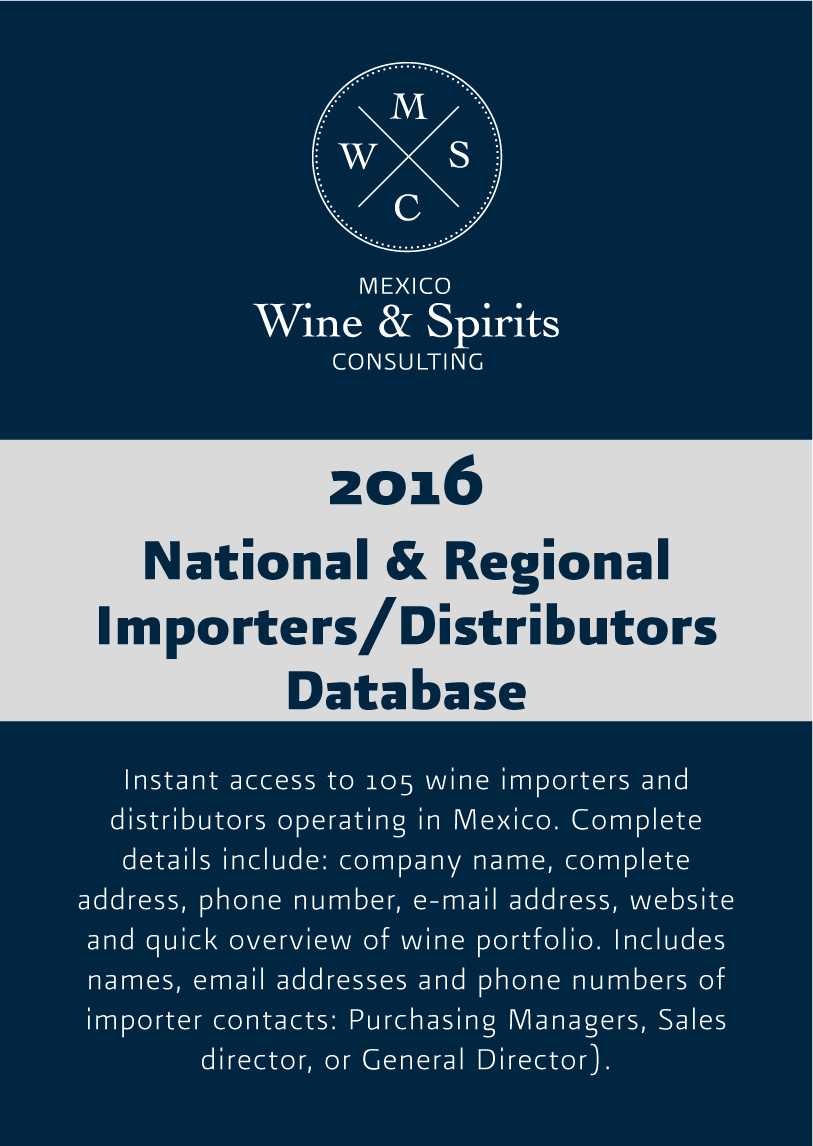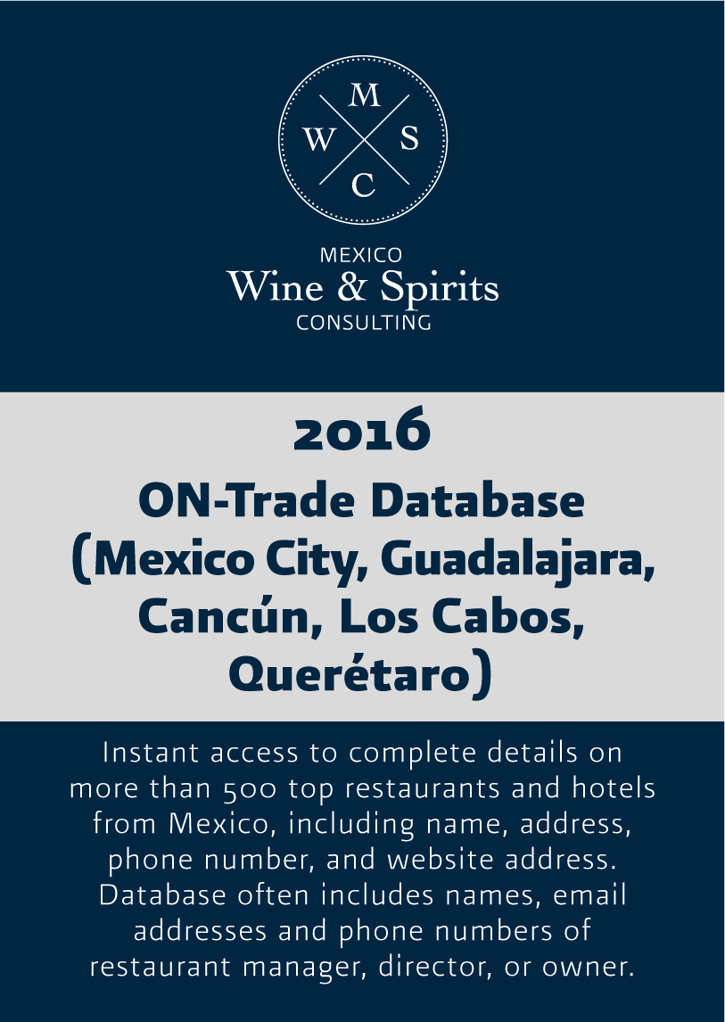 Get the most accurate and up to date information about Mexico’s geographic, economic, cultural/sociological environments, as well as wine market overview, consumption habits, market trends, distribution channels, regulation and key factors of success. Mexico Wine & Spirits Consulting manages comprehensive databases of importers, national and regional distributors, supermarket chains, specialty retailers, hotels, resorts and restaurants in Mexico’s top cities and wine business locations. Our analyses are based on our own exclusive field research, with input from the finest data providers available, including Euromonitor, Nielsen, and government reports. See our reports and access our market study: Doing Wine Business in Mexico.